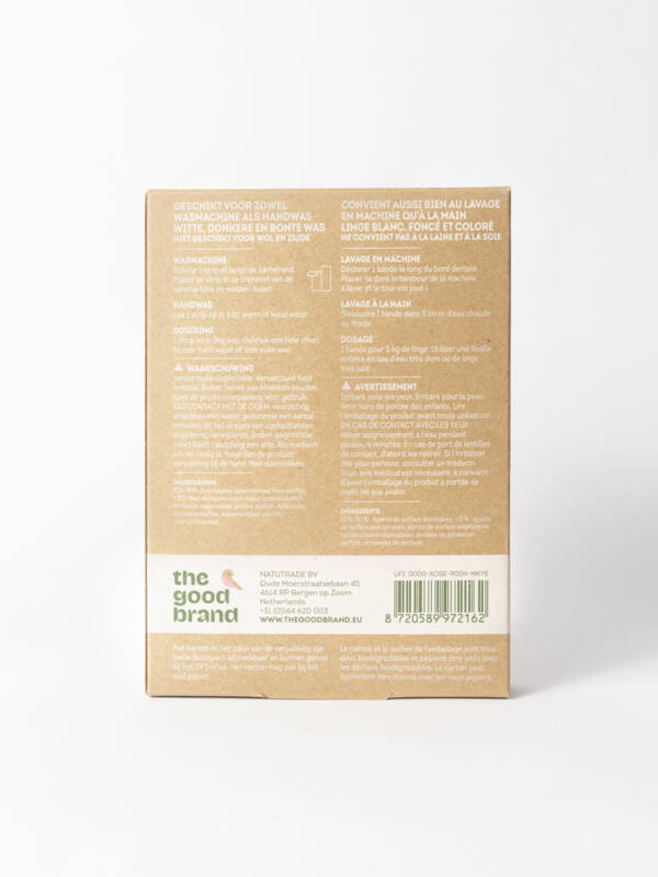 De oplosbare strip bevat een geconcentreerd wasmiddel dat volledig oplost in warm of koud water. De subtiele, frisse geur is hypoallergeen en de formule is vrij van palmolie, parabenen, fosfaten en microplastics. Je bespaart CO₂-uitstoot, ruimte en afval – zonder in te leveren op resultaat.