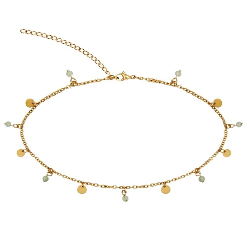 Een charmant enkelbandje met kleine goud kleurige plaatjes en groene quartz steentjes. Het bandje is met 5cm verstelbaar.