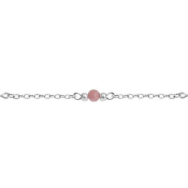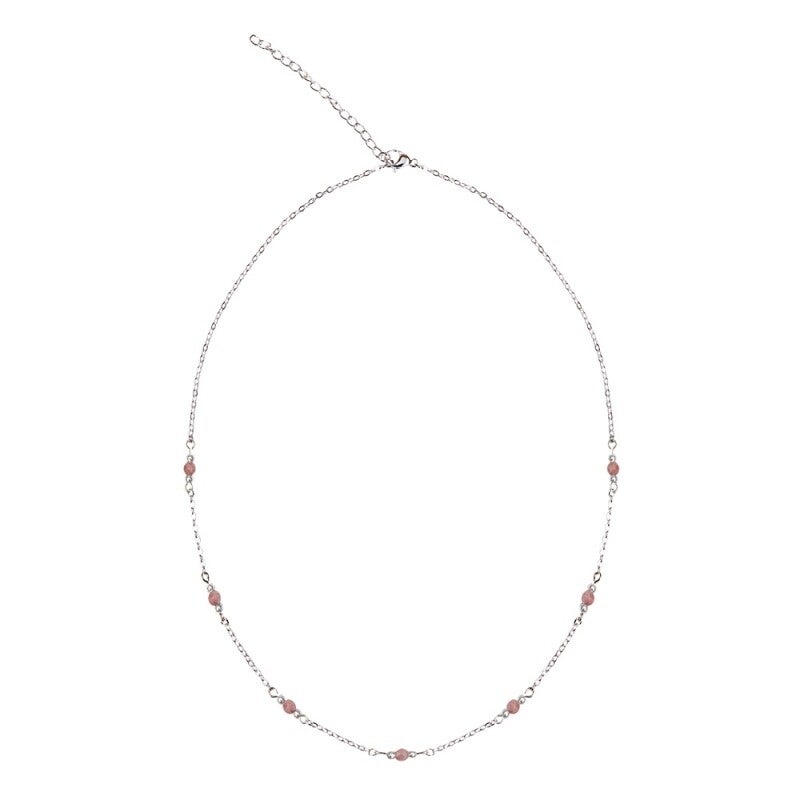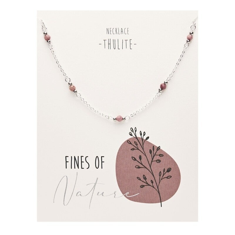 Een elegant, filigrane ketting met zeven kleine, gefacetteerde echte roze thuliet stenen. De ketting heeft een lengte van 40 cm plus nog een verlengkettinkje van ca. 5 cm waardoor hij variabel is in lengte.