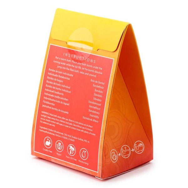 De bruisbal weegt 150 g en wordt geleverd in een stijlvolle oranje giftbox, direct klaar om cadeau te geven. Zodra de bruisbal oplost in warm water, vult de badkamer zich met de diepe, houtachtige geur van sandelhout. Het resultaat: een zachte huid, een kalme geest en een moment van pure ontspanning.